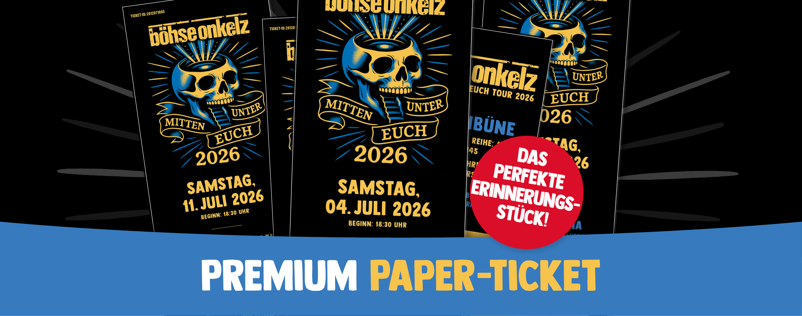 Wer sich immer wieder an das einzigartige Erlebnis mit den Böhsen Onkelz erinnern möchte, kann bei uns Premium Paper-Tickets ergattern – für einmalige Erinnerungen, die für immer bleiben! Einfach Tickets per Postversand bestellen!